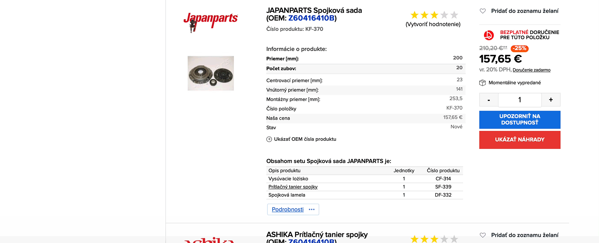 Zoznam alternatív sa zobrazí ak hľadáte diely podľa OEM čísla. Alternatíva je produkt, ktorý má podobné alebo identické vlastnosti. Hneď po zadaní OEM čísla nezabudnite porovnať vlastnosti alternatív zobrazených v zozname. Ak si musíte vybrať z množstva výsledkov hľadania, pozorne si prečítajte a porovnajte vlastnosti alternatívnych produktov s originálnymi produktmi, alebo kontaktujte tím služieb pre zákazníkov a požiadajte ho o pomoc. Ak náhradný diel, ktorý potrebujete, je momentálne vypredaný, použite tlačidlo "Ukázať náhrady ". Zobrazí sa vám zoznam produktov s podobnými alebo identickými vlastnosťami, avšak od iných značiek, a možno aj z iných cenových kategórií.