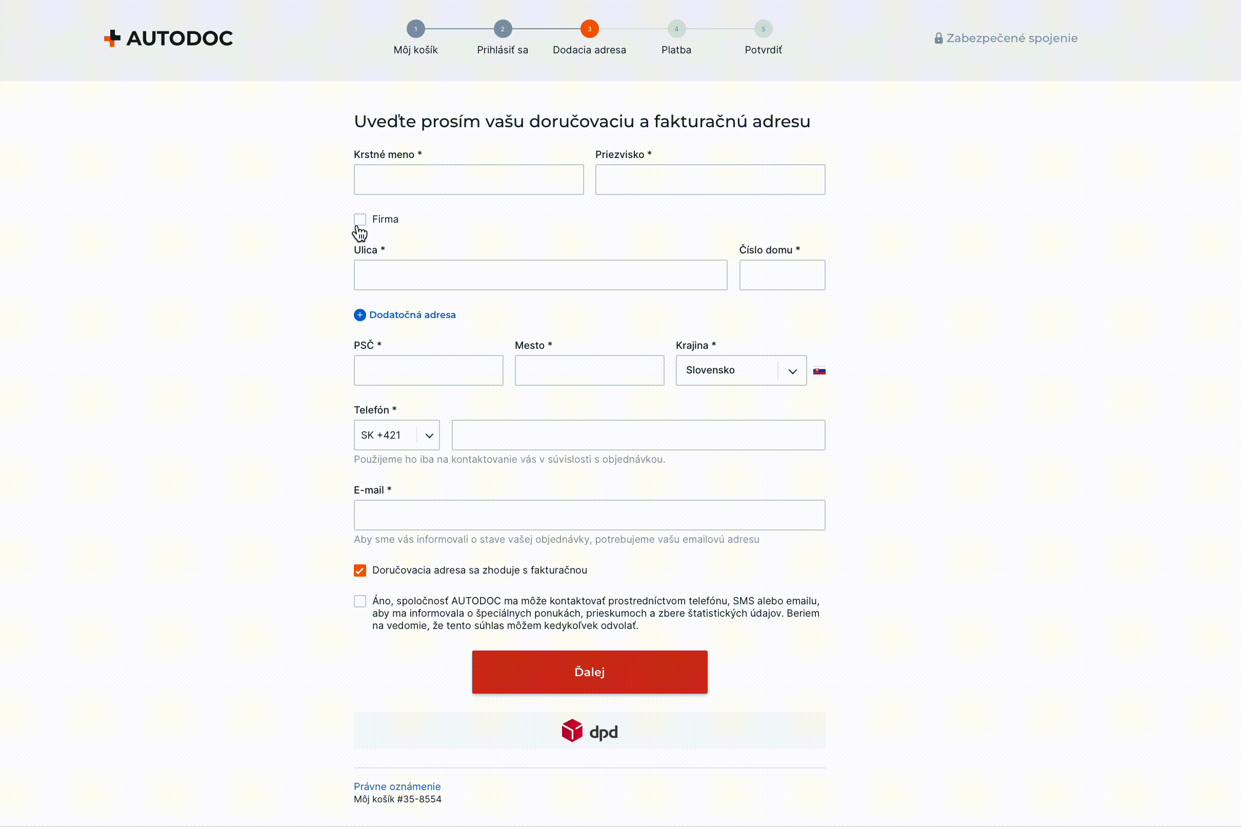 Ak potrebuješ, aby boli doručovacia a fakturačná adresa rozdielne, pole Doručovacia adresa sa zhoduje s fakturačnou je potrebné odznačiť.